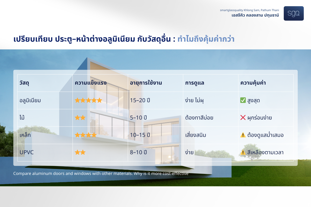จากตารางจะเห็นว่า “อลูมิเนียม” คุ้มค่ากว่าในระยะยาว ทั้งในด้านอายุการใช้งาน ความสวยงาม และความสะดวกในการบำรุงรักษา