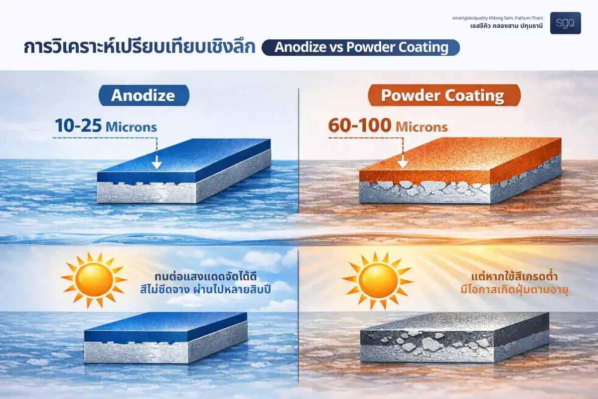 This article provides an in-depth analysis of the technical limitations of anodizing, compares film thickness and UV resistance with Powder Coating, and includes recommendations from the SGQ Khlong Sam installation team.