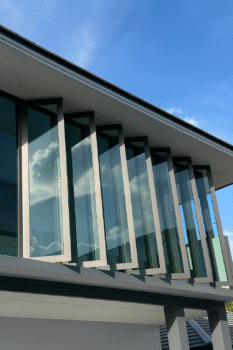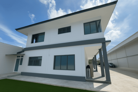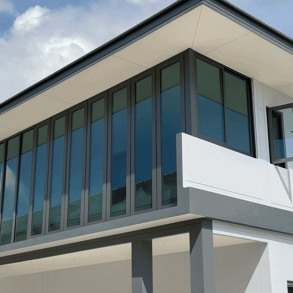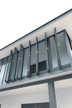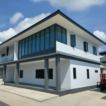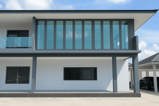 SGQ 为巴吞他尼 Khlong 4 独栋住宅安装铝合金门窗系统,以大型垂直采光窗为设计重点,大幅提升室内通透度并充分引入自然光。深灰色铝框强化建筑线条的清晰度,而每一扇门窗皆以精细工艺组装,确保操作顺畅、结构稳固,并能长期耐受户外气候变化。