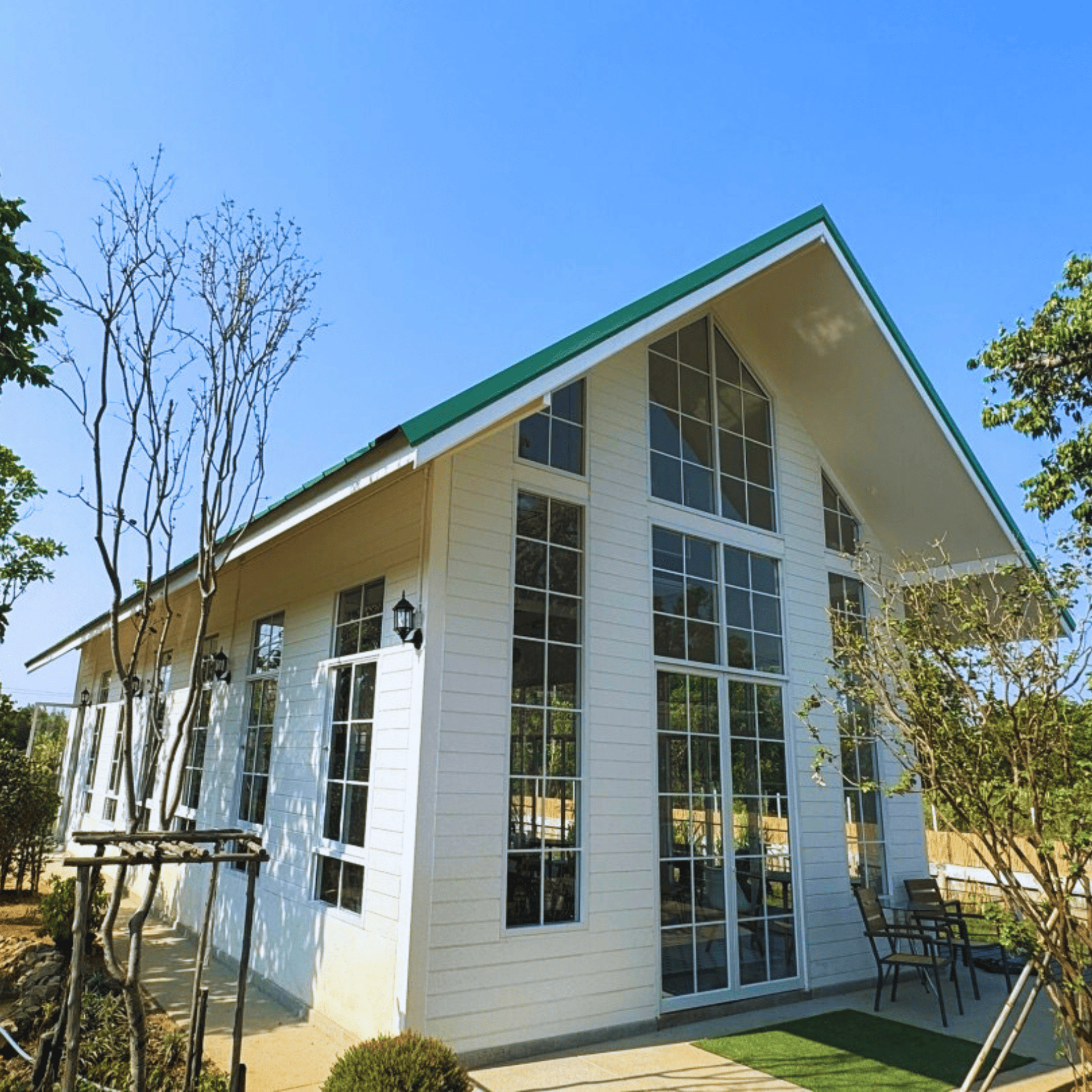 SGQ 为极简风咖啡馆安装白色铝合金门窗系统,高挑通透的门窗设计使自然光充分进入室内。白色铝框营造干净明亮的视觉效果,与双坡屋顶建筑风格完美融合。所有门窗皆以精细工艺组装,结构稳固,操作顺畅,满足日常使用的所有需求。